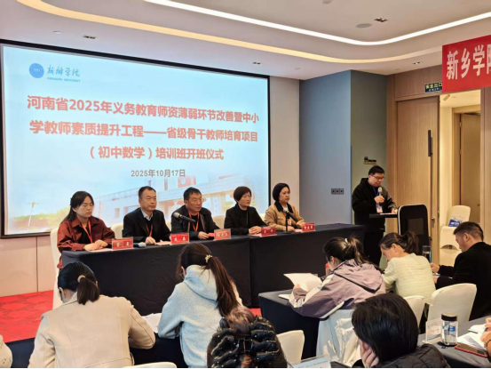 10月17日上午,由我校中小学教师校长研修院承办、数学与统计学院组织实施的“省培计划(2025)”初中数学骨干教师研修班在新乡艺悦宾馆举行了开班仪式。新乡学院数学与统计学院院长张之正、中小学教师校长研修院副院长宋华、项目工作组全体成员以及研修班的83名参训教师参加了开班仪式。开班仪式由数学与统计学院副院长皮磊主持。
