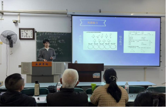 随后,6位学生代表依次登台,结合见习期间积累的教学经验展开展示,内容覆盖中小学数学核心知识点。刘奥哲以“三角形的分类”为题,通过“实物观察—标准梳理—案例辨析”三步教学法,清晰呈现分类逻辑;赵淑珍聚焦“平方根”抽象概念,借助“面积计算—边长推导—生活应用”实例链,降低理解难度;芦洋熙讲解“等腰三角形”时,从“性质证明—变式训练—实际解题”构建完整教学闭环;蒋嘉惠针对“三角形的中线、角平分线和高”,用动态图形演示+对比表格,强化知识点区分度;陈梦瑶以“鸡兔同笼、燕雀称重”中国古典数学问题切入,自然引出“二元一次方程组的概念”;杨晓莹设计“气温变化、财务管理”互动环节,让“有理数的加法运算”课堂更具趣味性。6位同学的展示均融入见习期间习得的课堂管理技巧,展现出初步的教学驾驭能力。