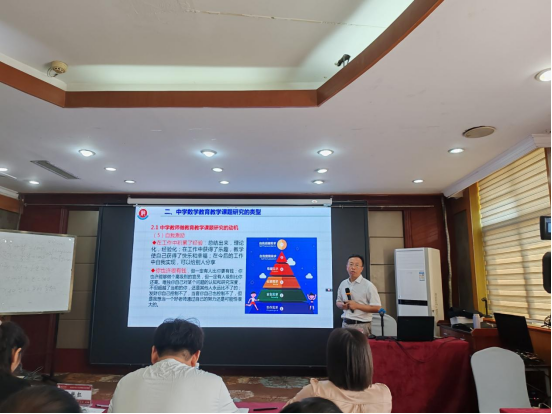 赵院长从课题研究的时代需求、现实需求以及数学教育教学中存在的问题为引,从宏观到微观的层面详细阐述进行课题研究的原因。在剖析原因后,从国内外先进的教学方法理论、教学发展的新形势下的教学手段、教学模式、教学效果等方面,给出中学数学教育教学课题研究的方向。同时,也鼓舞培训学员教师们自我激励,做出改变,加入课题申报研究的行列,并详细介绍了课题研究几种的类型,供老师们参考。最后,赵院长结合自身多年研究经验,分享课题申报的相关要点,提醒青年教师要多读数学史、数学建模等方面相关书籍,提前为课题申报做准备。