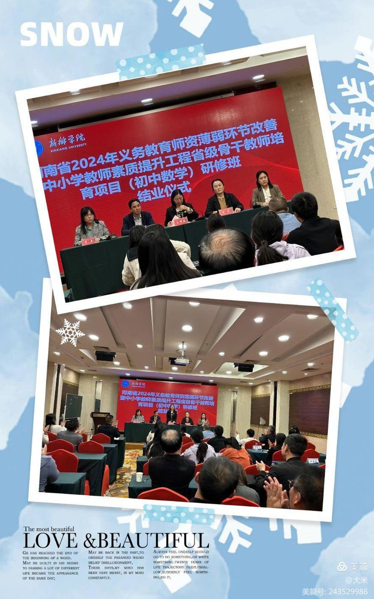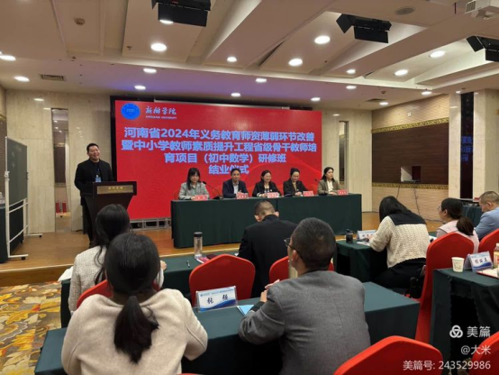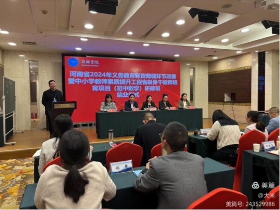 新乡学院数学与统计学院党委书记毛群英、新乡学院中小学教师校长研修院副院长宋华、河南省教师教育培训专家魏银光教授、新乡学院数学与统计学院教师郭建霞、省级骨干教师初中数学研修班项目组成员、省级骨干教师初中数学研修班全体参训学员参加了结业仪式。新乡学院的几位领导的到来引起了会场雷鸣般的掌声。毛书记高度肯定了老师们的教学水平,更期望在未来的教学工作中,老师们能够将所学知识运用到实际教学中,不断创新教学方法,提高教学质量,为学生的成长和发展贡献自己的力量。